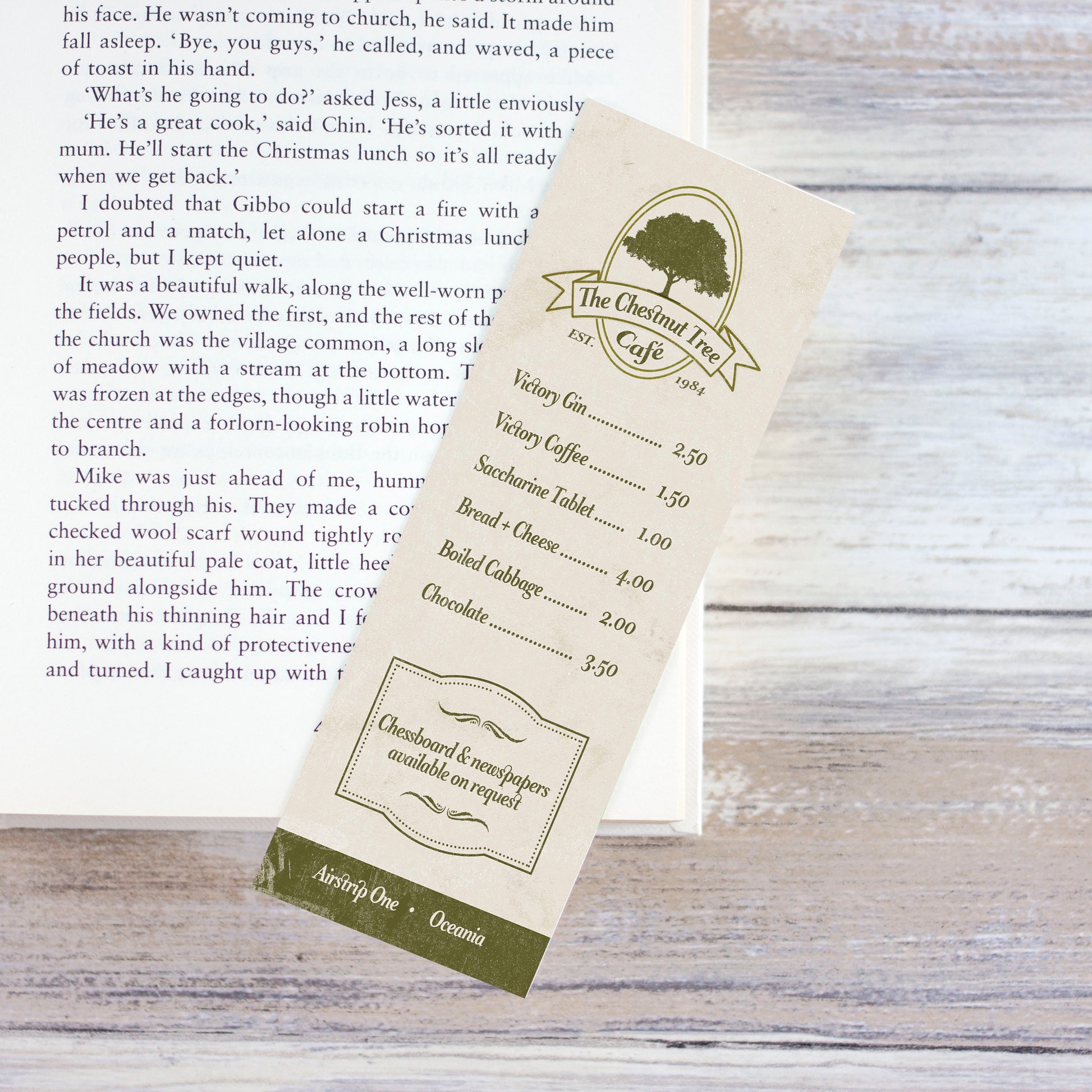 Bookmark inspired by George Orwell's novel '1984' featuring the menu from The Chestnut Tree Café: the place where rebels and lovers meet for illicit conversations.