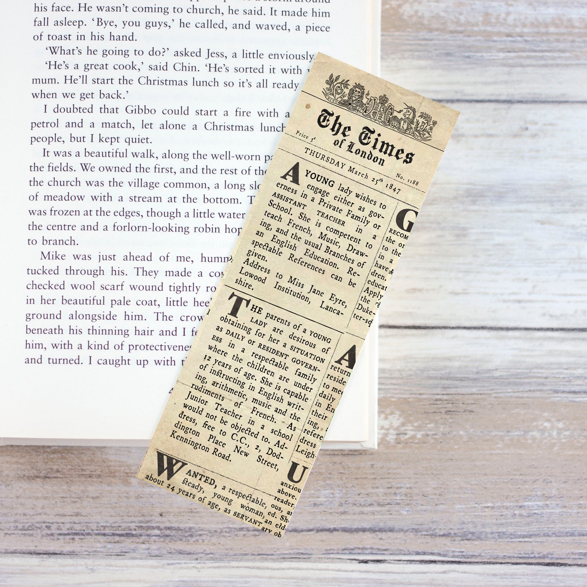 Bookmark inspired by the novel Jane Eyre by Charlotte Bronte. This replica Victorian newspaper bookmark shows Jane's advertisement which acquired her the position of governess to Adele at Thornfield Hall.