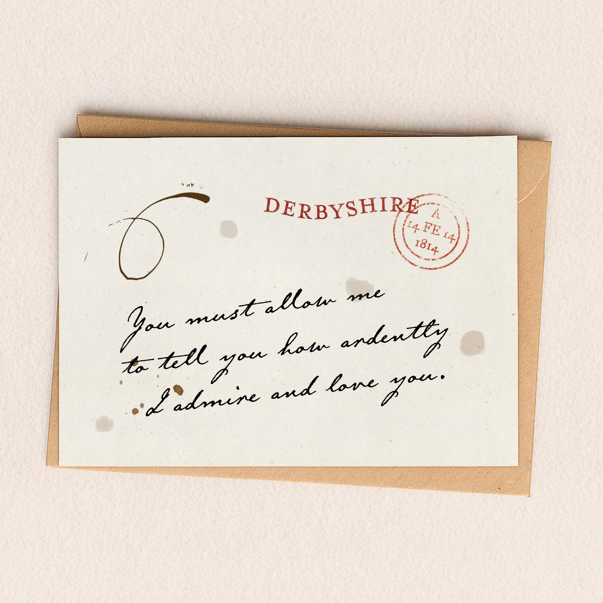 Declare your literary devotion with this charming greeting card inspired by Jane Austen's most swoon-worthy moment. Designed to resemble a Regency-era letter complete with a Derbyshire stamp, it's the perfect way to express your feelings to a fellow book lover. Whether for Valentine's Day, an anniversary, or simply to celebrate your shared passion for classic romance, this card captures Mr Darcy's heartfelt sentiment in elegant style. A delightful gift for Austen enthusiasts who appreciate wit, romance and a touch of period charm.