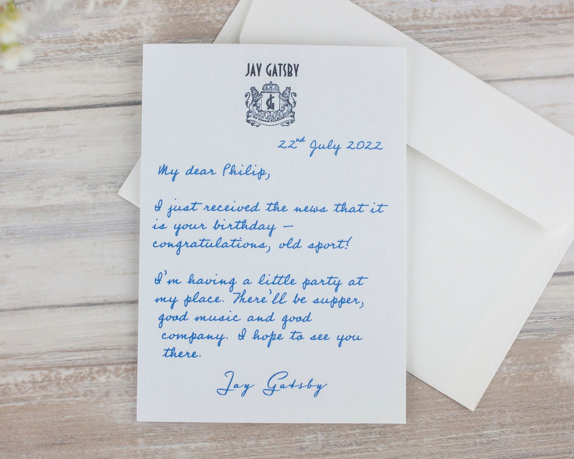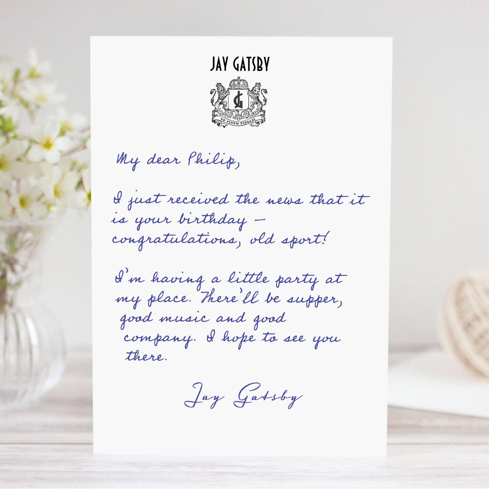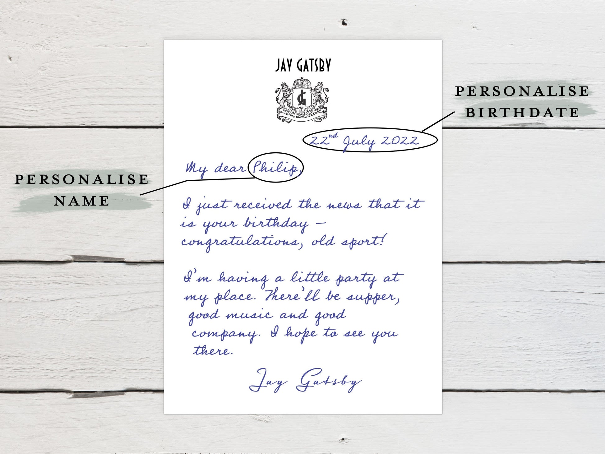 This is a personalised birthday card featuring a special letter from Jay Gatsby (on his own letterhead paper) inviting you to a party at his mansion.