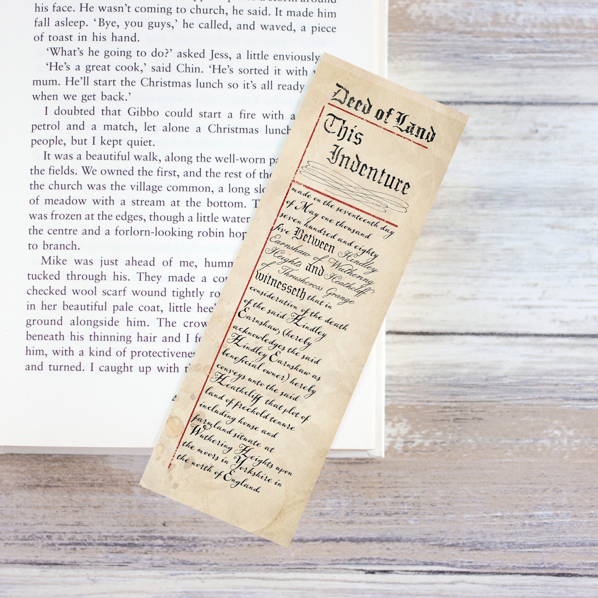 This bookmark, inspired by the novel Wuthering Heights by Emily Bronte, has been carefully designed to look like a vintage Deed of Land showing the transfer of ownership of Wuthering Heights from Hindley to Heathcliff.
